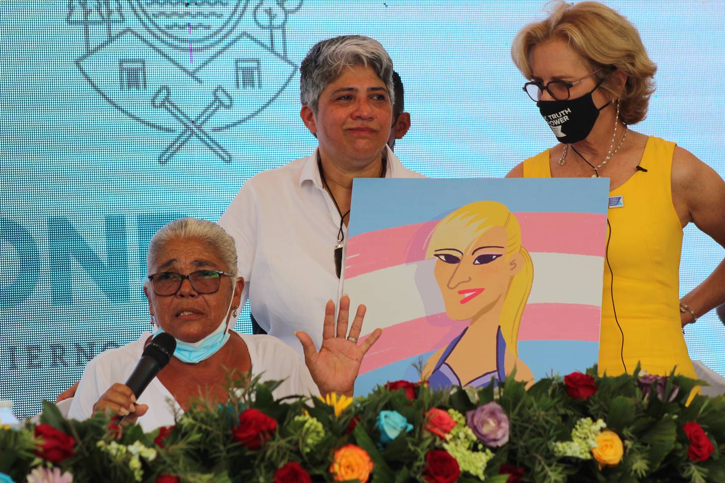 Pie de foto: La madre de Vicky Hernández, Rosa Argelia Hernández, acompañada de Indyra Mendoza y Kerry Kennedy.(Cortesía: SEDH), 09 de mayo 2022.